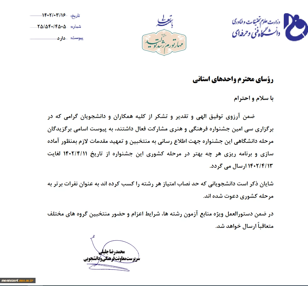 اسامی برگزیدگان مرحله دانشگاهی سی اُمین جشنواره قرآن - عترت دانشگاه فنی و حرفه ای جهت انتخابی مرحله کشوری 2
